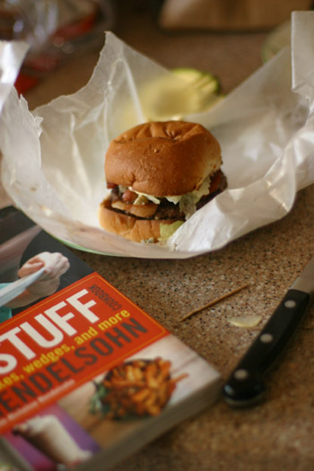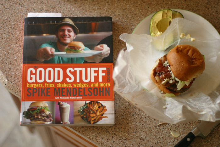 Stumbling around the cooking section shelves at the local library, I tug on a book not so much because of it’s title, more because the photos catch my attention. The book is titled The Good Stuff Cookbook Burgers, Fries, Shakes, Wedges, and More by chef Spike Mendelsohn.