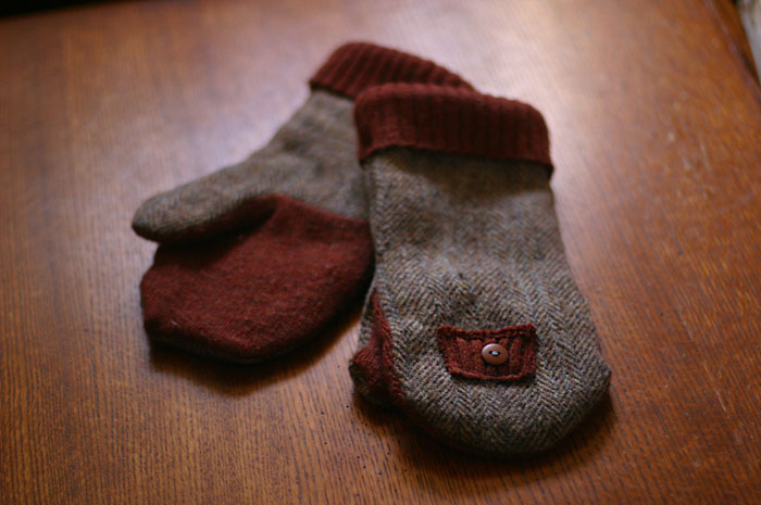 Iknow a lady that wouldn’t call herself one, but I do, I call her an artist. She has a knack for keeping and creating items loaded with nostalgic memories. Her house is filled with trinkets and mementos, even mundane things that each have a little story or association from her life. We all do it, but somehow she seems to have a knack at it. She sewed me these mittens made from an old man’s coat & sweater. Somehow they seem just right. Time to tug them on for a walk down to the corner drug store.